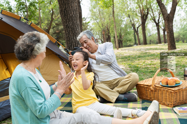 图片标题: 老年夫妇带着孙女在公园里郊游
