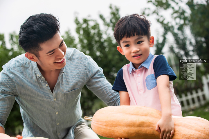 图片标题: 东方父子采摘南瓜