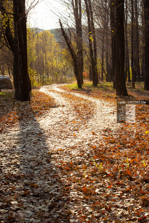 图片标题: 阳光照射下铺满树叶弯曲的小路