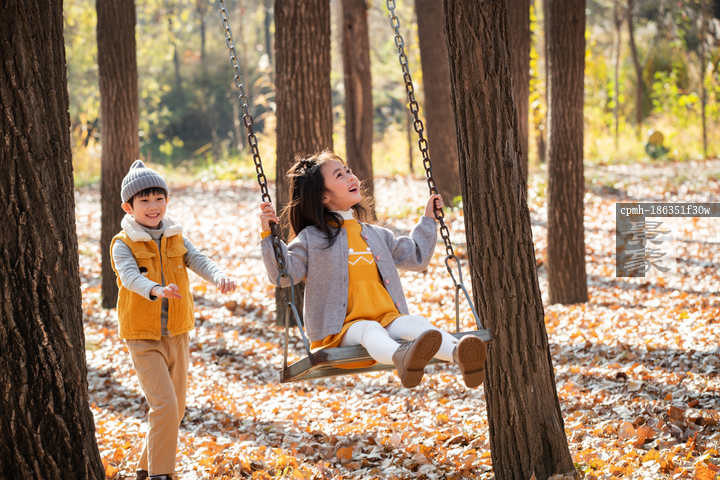 图片标题: 户外小男孩推小女孩荡秋千