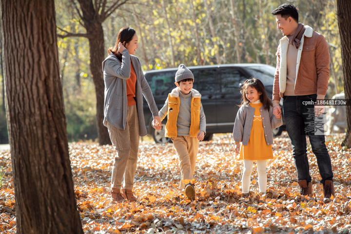 图片标题: 秋天幸福家庭在户外散步
