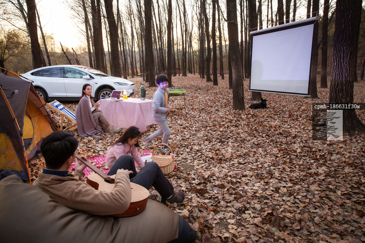 图片标题: 秋天傍晚幸福家庭在户外露营