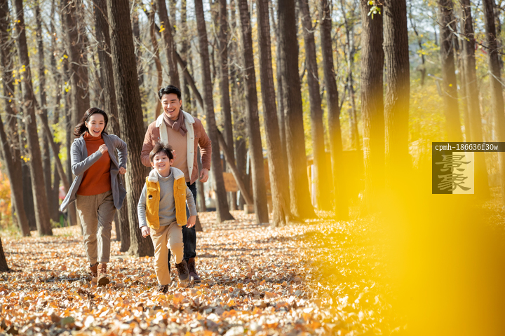 图片标题: 幸福三口之家在户外散步