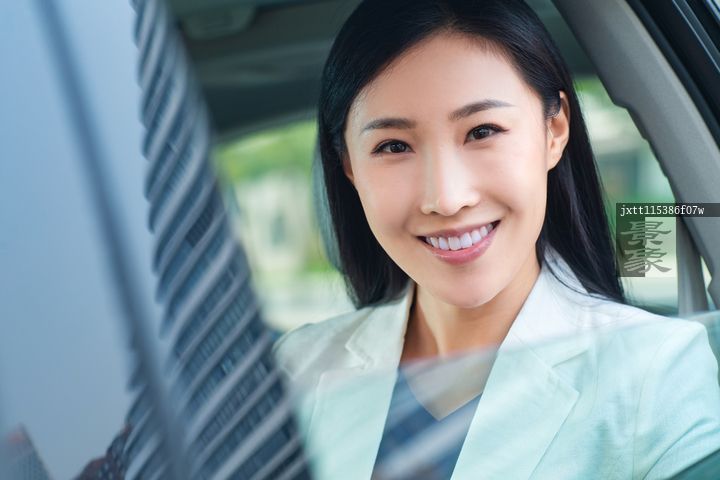 图片标题: 年轻女人坐在汽车里