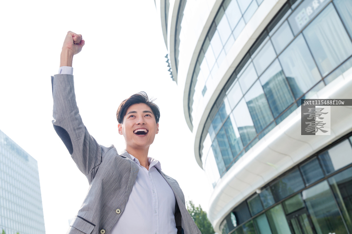 图片标题: 振臂欢呼的青年商务男士