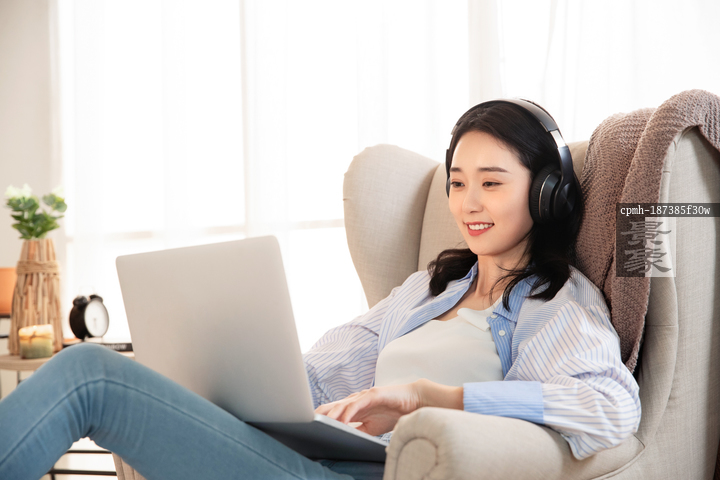 图片标题: 快乐的女青年坐在沙发上使用笔记本电脑