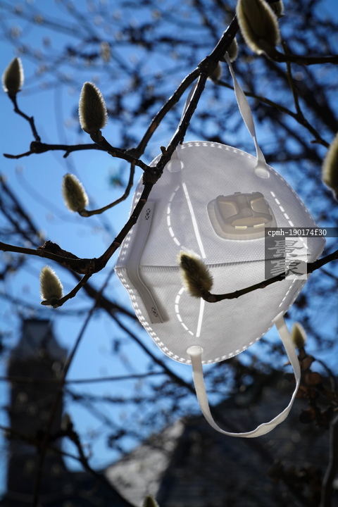 图片标题: 悬挂在树枝上的口罩