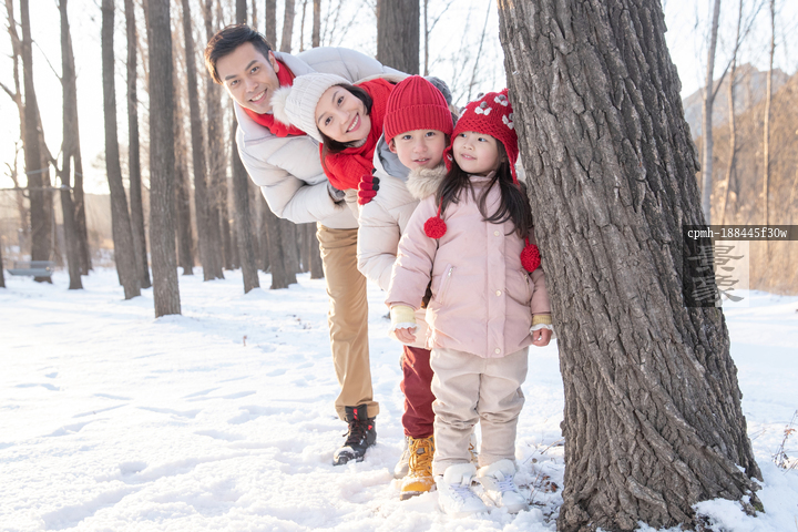 图片标题: 快乐家庭在雪地里玩耍