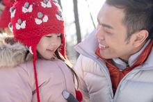 图片标题: 推着雪橇玩耍的一家人