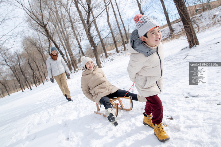 图片标题: 在雪地上玩雪橇的一家人