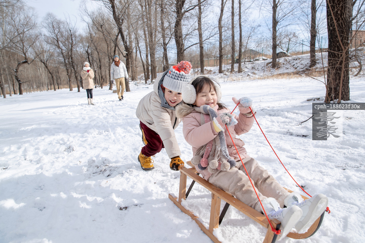 图片标题: 欢乐家庭在雪地上玩雪橇
