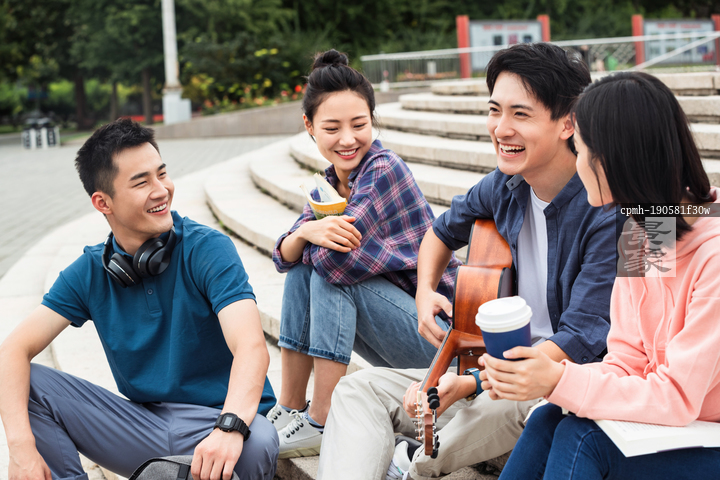 图片标题: 年轻的大学生坐在台阶上闲聊
