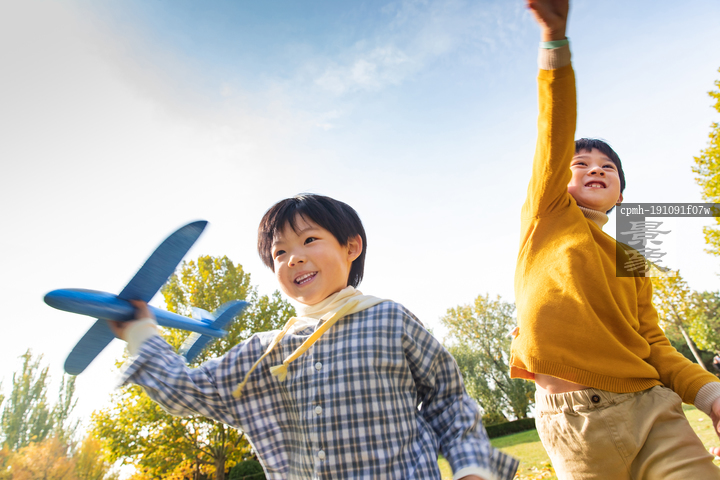 图片标题: 拿着玩具飞机在公园玩耍的男孩