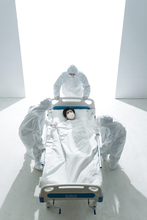 图片标题: 医务工作者推着病床上的患者