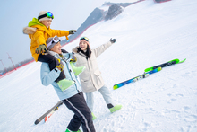 图片标题: 滑雪场快乐的青年伴侣拿着雪具