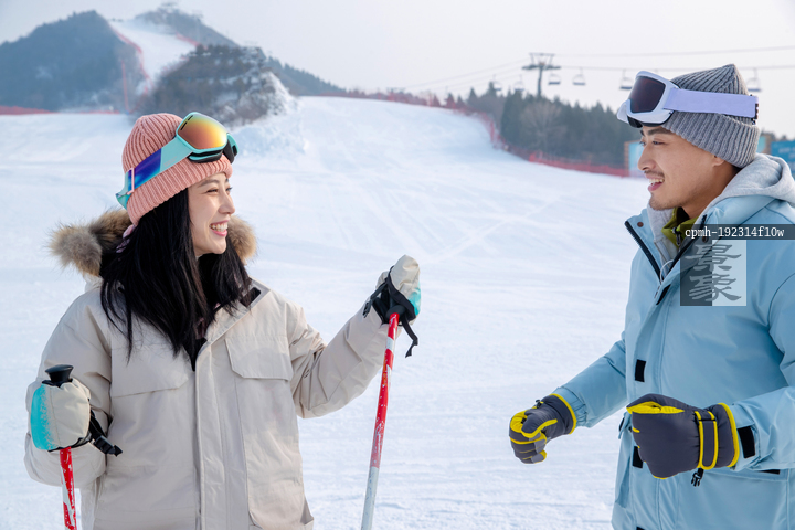 图片标题: 滑雪场上教女朋友滑雪的青年男人