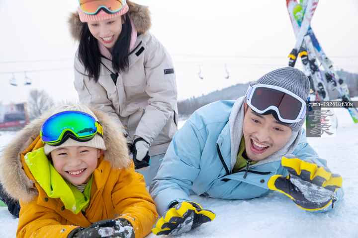 图片标题: 快乐的一家三口在雪地上玩雪