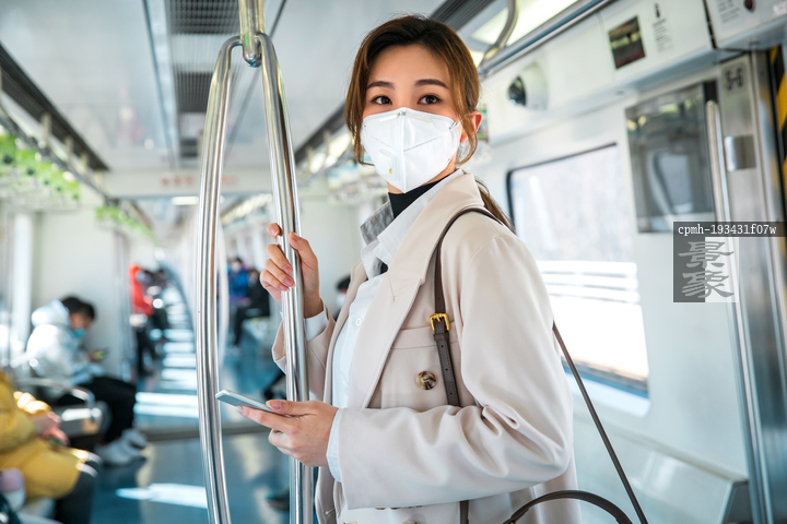 图片标题: 戴口罩的年轻女人乘坐地铁