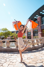 图片标题: 坐在喷泉旁边的快乐女人