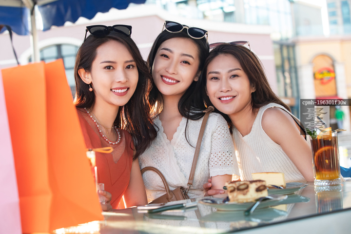 图片标题: 年轻女孩们坐在路边咖啡馆享受下午茶肖像