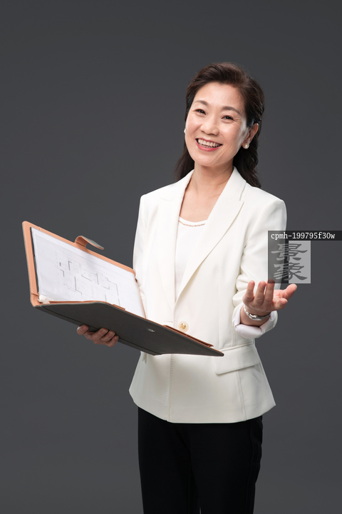 图片标题: 拿着户型图册做出邀请手势的优雅商务女士