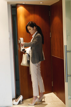 图片标题: 青年女人站在门口看时间