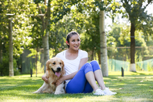 图片标题: 青年女人和宠物狗玩耍