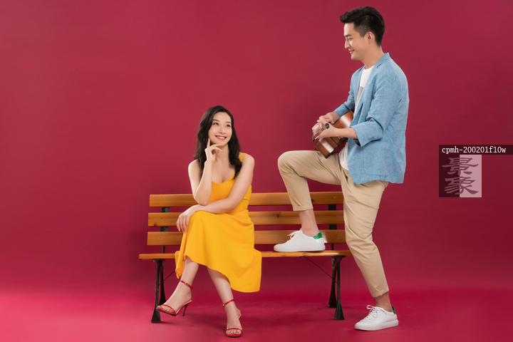图片标题: 青年男人弹吉他给女朋友听