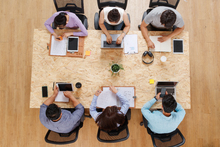 图片标题: 使用电子设备工作的商务人群