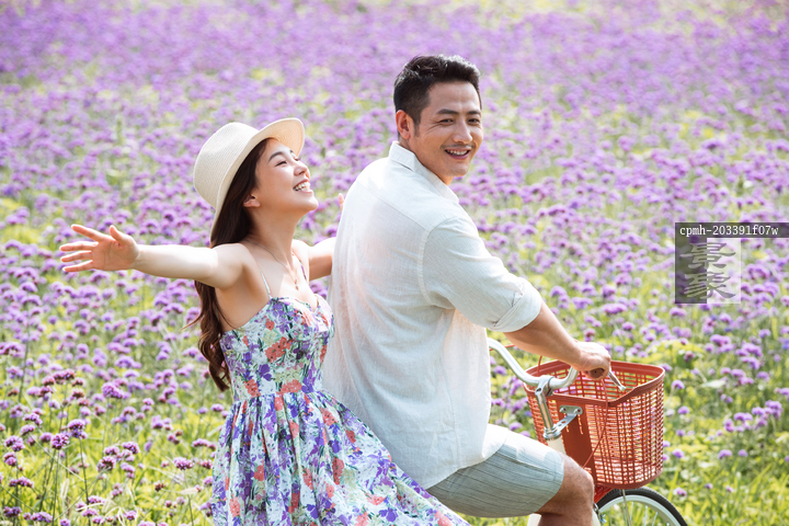 图片标题: 青年夫妇在花海里骑车