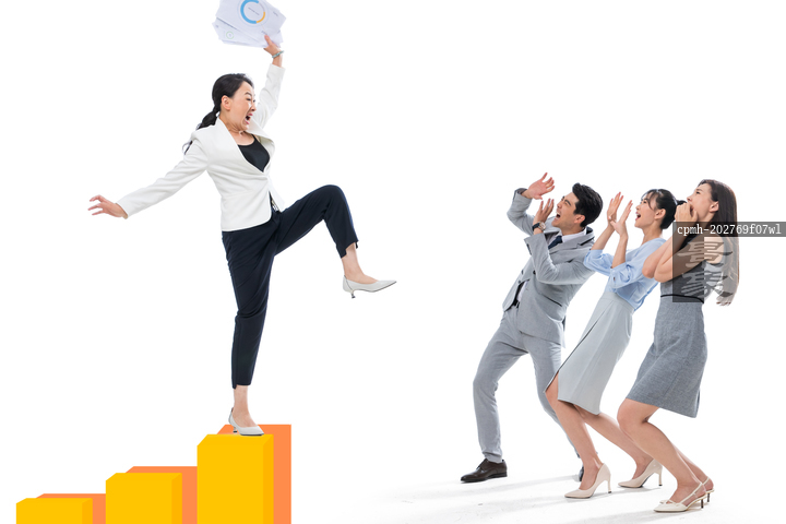 图片标题: 成熟商务女士站在条形图上朝下属发火