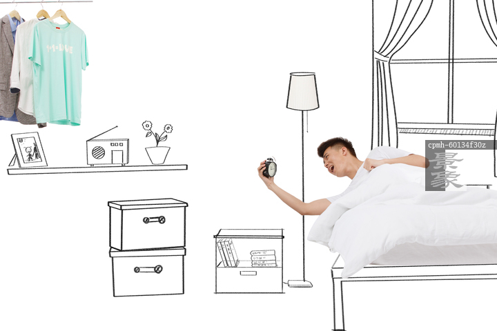 图片标题: 青年男人拿闹钟看时间