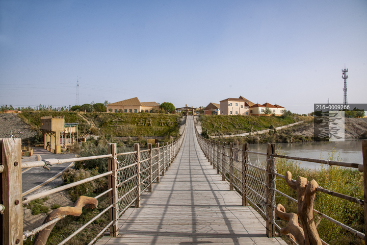 图片标题: 新疆泽普金胡杨国家森林园区叶尔羌河上的树桩吊桥