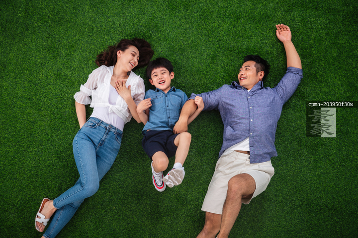 图片标题: 快乐的一家三口躺在草地上玩耍