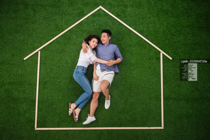 图片标题: 青年伴侣躺在草地上的房子轮廓里