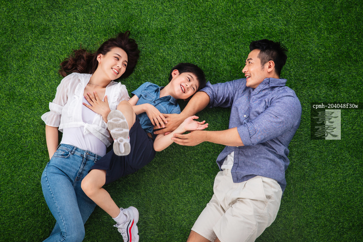 图片标题: 快乐的一家三口躺在草地上嬉戏