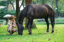 图片标题: 马厩里快乐的姐妹牵着马