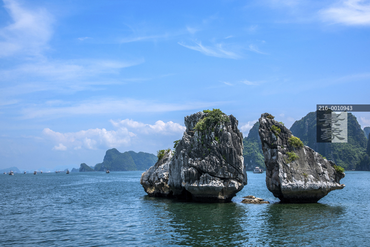 图片标题: 越南广宁鸿基市下龙湾海上远眺斗鸡石