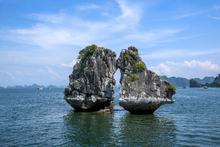 图片标题: 越南广宁鸿基市下龙湾海上远眺斗鸡石