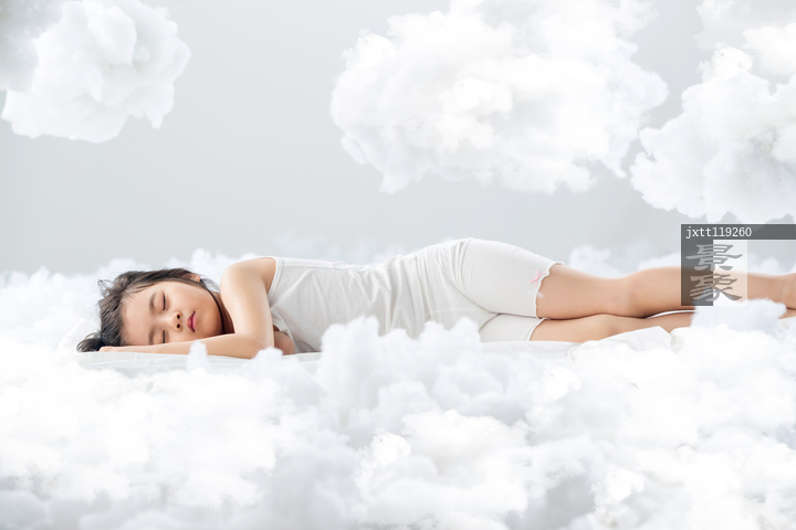 图片标题: 可爱的小女孩躺在云朵上