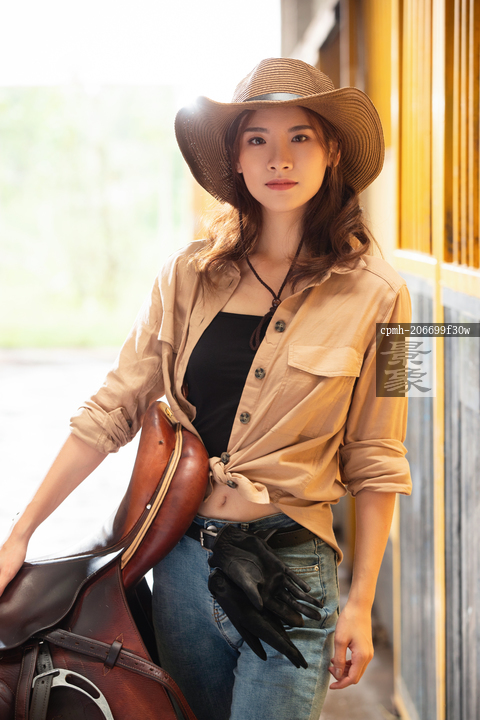 图片标题: 马厩里抱着马鞍的个性青年女人