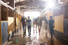 图片标题: 户外快乐的青年女人牵着马