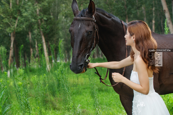 图片标题: 骏马和穿着婚纱的漂亮年轻女人