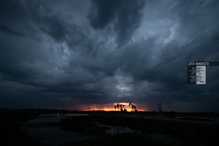 图片标题: 晚霞中的采油树