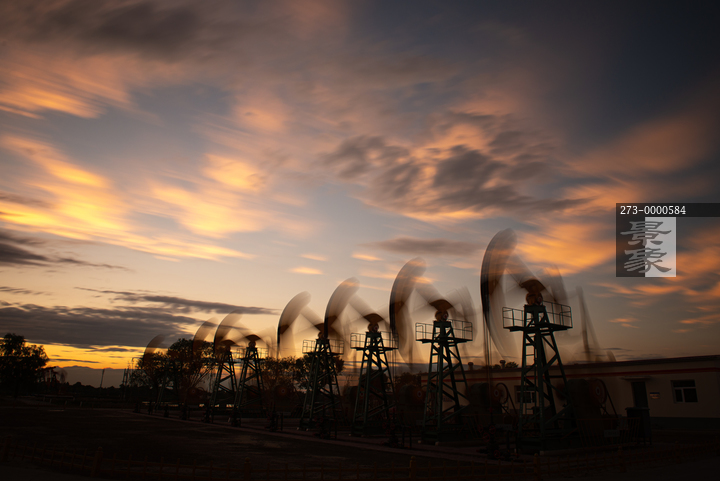 图片标题: 晚霞中的采油树