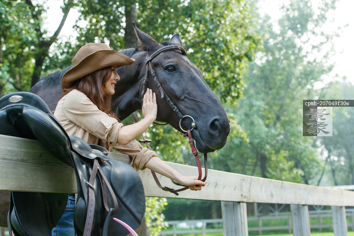图片标题: 围栏旁的快乐个性青年女人和马玩耍
