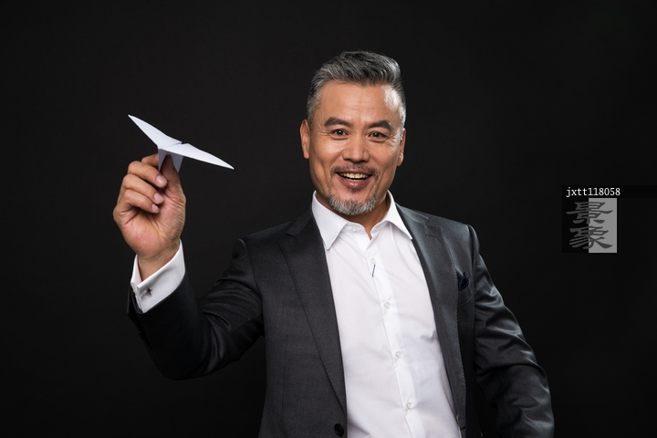 图片标题: 商务男士拿着纸飞机