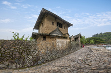 图片标题: 福建漳州南靖云水瑶古镇大榕树下小溪边的古栈道