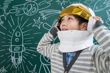 图片标题: 站在行李箱上拿纸飞机的快乐女孩
