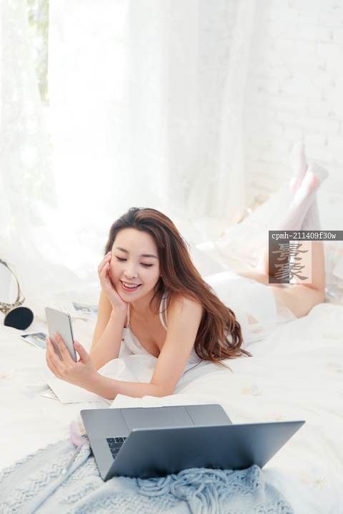 图片标题: 趴在床上度过闲暇时光的青年女人